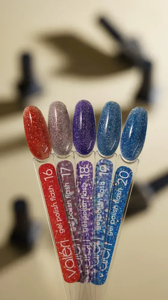 У колекції іскристих гель-лаків Flash - мерехтливих відтінків, що переливаються неймовірним блиском. Інтенсивність сяйва покриття залежить від кута попадання світла і потужності джерела освітлення.