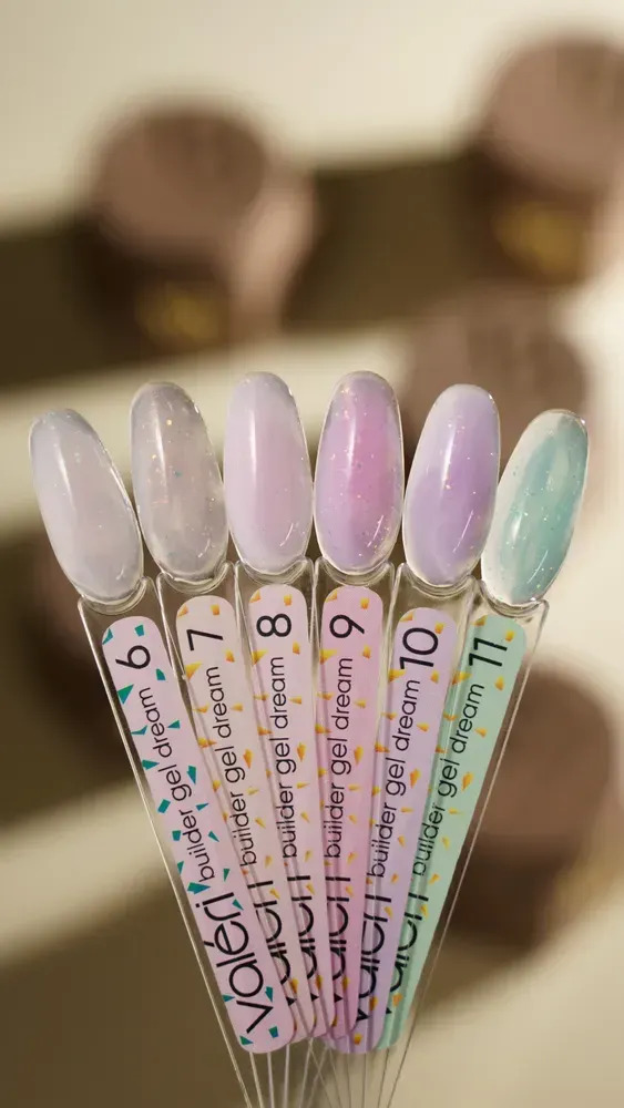 Valeri Gel Dream Collection — це колекція гелів, які можна використовувати як для нарощення нігтів, так і для корекції й укріплення нігтьової пластини. Гелі низькотемпературні, тверді, середньої густини, тому дуже добре самовирівнюється, але й не розтікаються. Пігментація середня. Легкі у нанесенні та добре тримають арку нігтя. Гелі Valeri підходять для використання як у однофазній, так і у трифазній системі. Завдяки чудовій консистенції можна працювати у техніці без опилу або з мінімальним опилом.