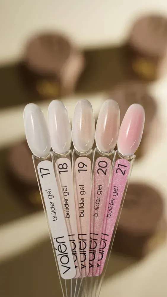 Valeri Builder Gel Collection – це колекція гелів, які використовуються як для нарощення нігтів, так і для корекції й укріплення нігтьової пластини. Це низькотемпературний гель з високим ступенем адгезії, твердий, середньої густини (ближче до густої) за рахунок чого дуже добре самовирівнюється, але не затікає. Пігментація – середня. Легкі у нанесенні та добре тримають арку нігтя.